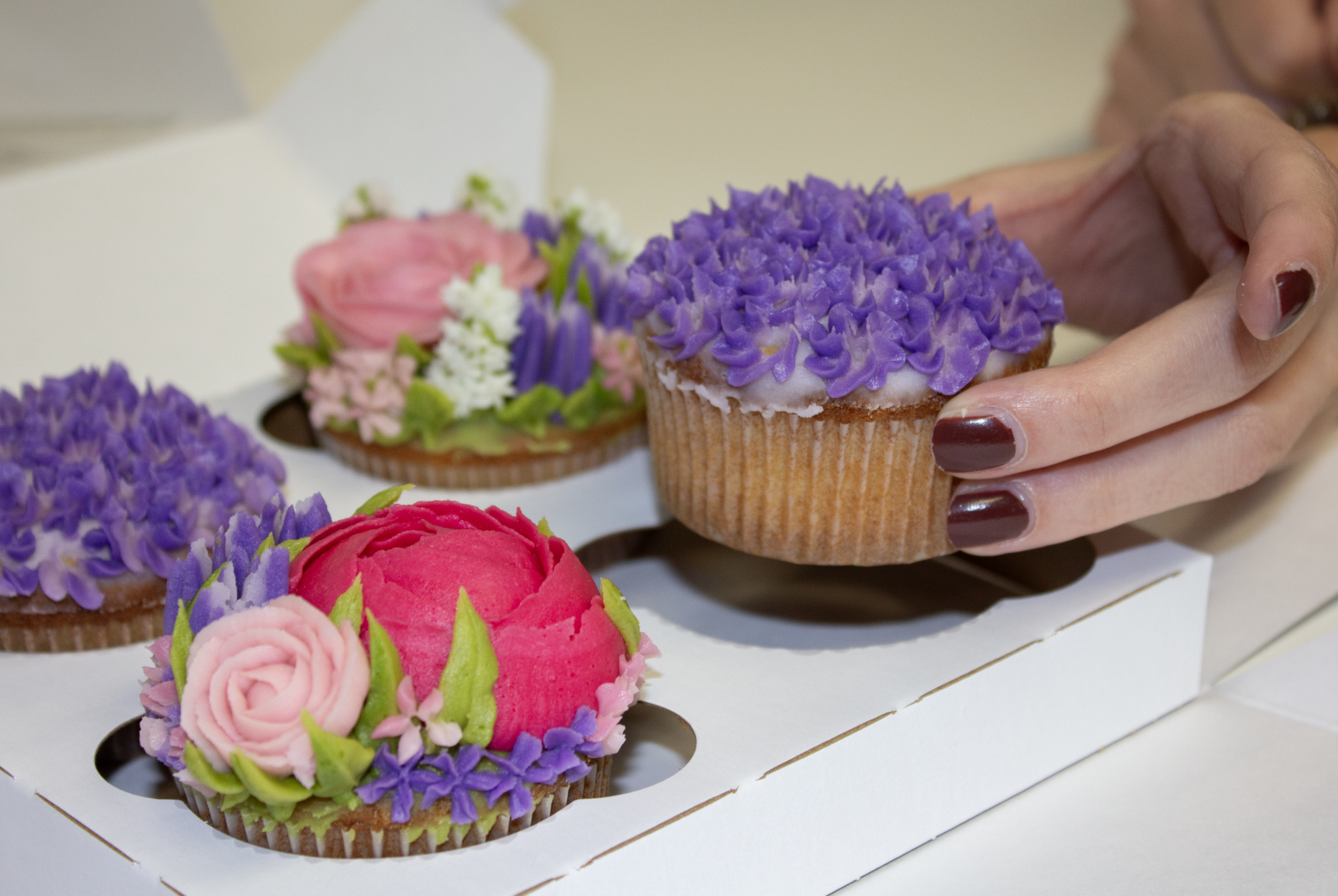 In the same vein as flowers, “I want people to think of them like giving a gift,” Jessica says. Orders come boxed or wrapped like a bouquet. Cupcakes currently come in chocolate and vanilla flavors, and she plans to add a lemon in the spring.