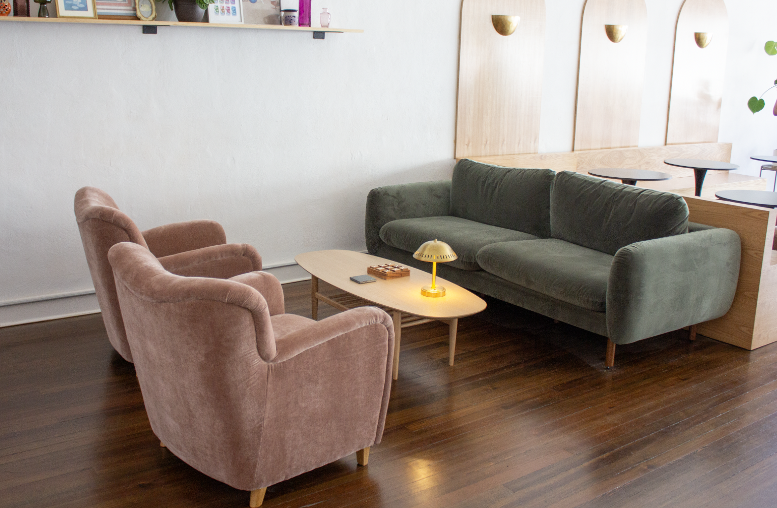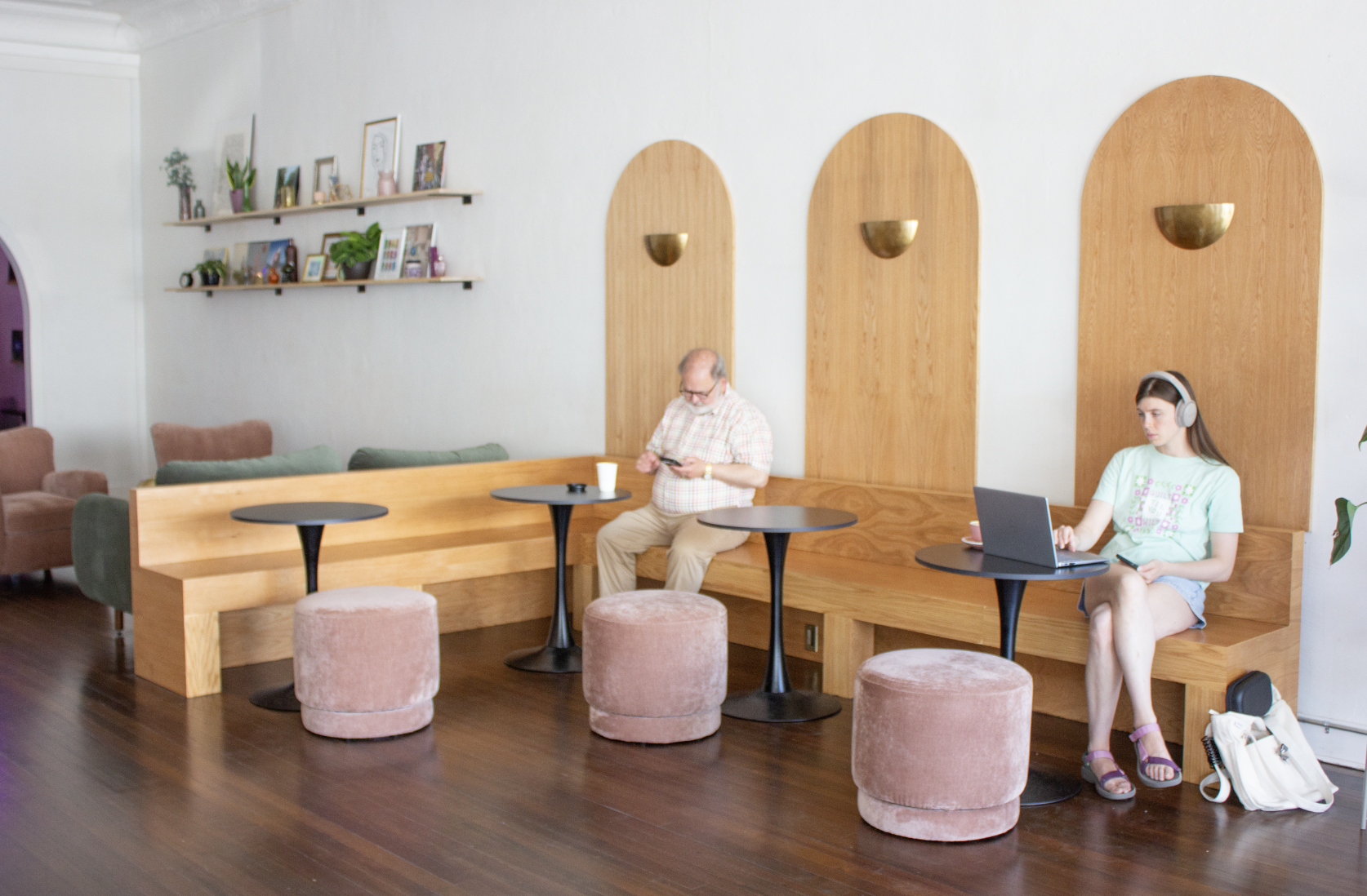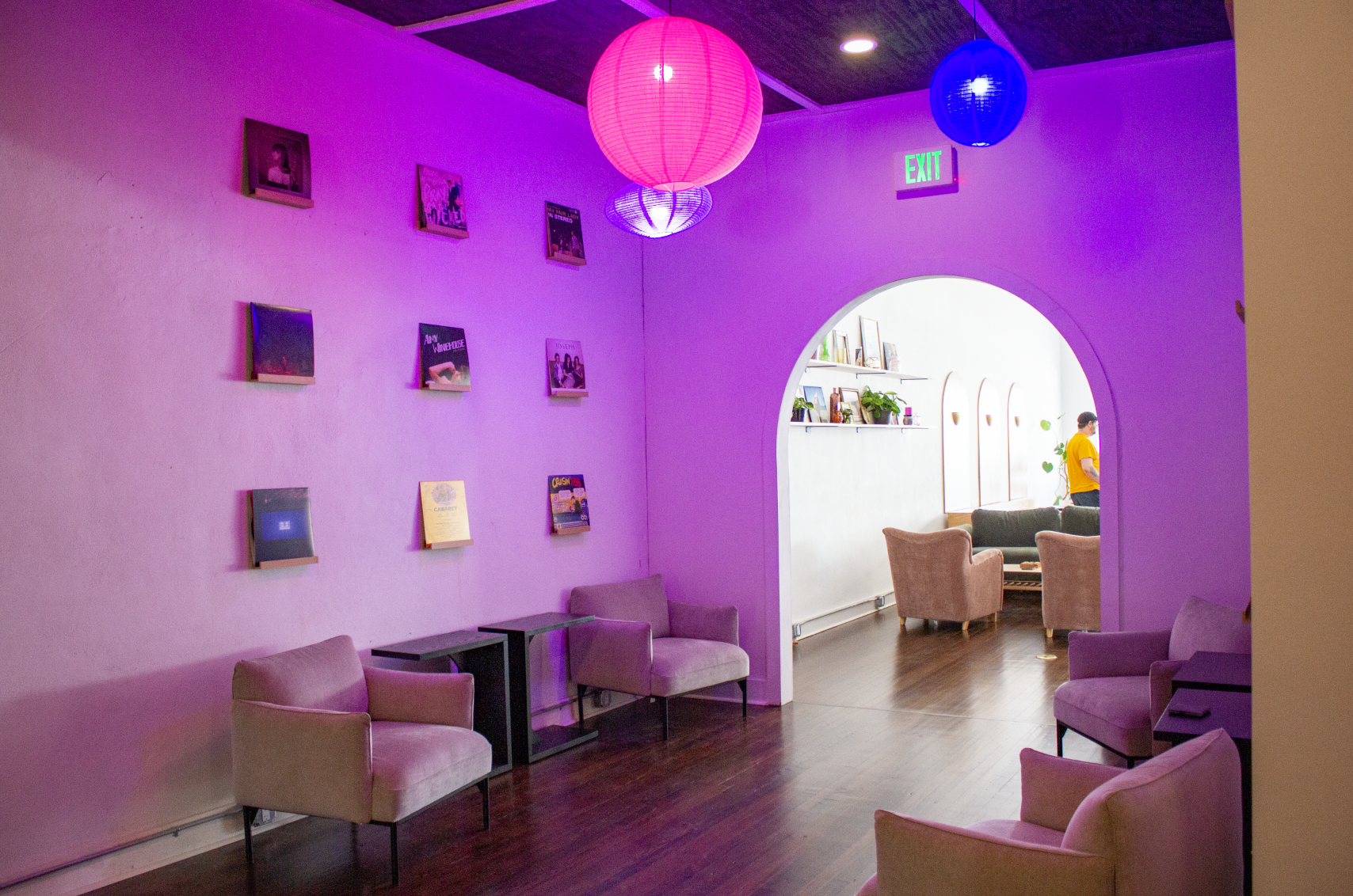 The midcentury modern-inspired space features a variety of seating and decor, like old vinyl records from their personal collections. “We were very intentional about every piece of furniture,” says Hanna. They also made the backroom sensory-friendly for families, complete with a growing board game collection and projector to eventually host community-style events such as movie nights or Super Mario tournaments. DJ is especially excited for live music, but there is no set schedule yet.